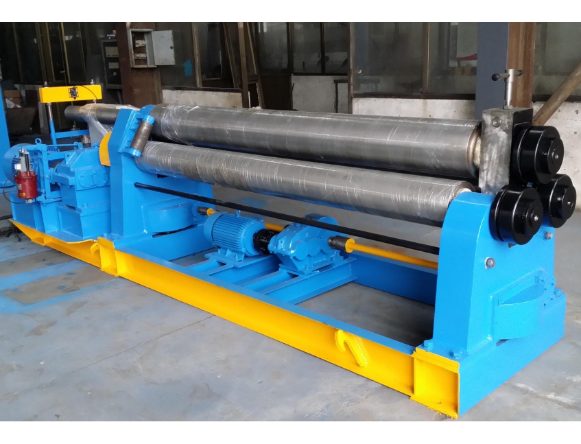 W11對稱卷板機是全機械對稱式三輥卷板機。 三個滾筒全部固定,像金字塔一樣放置。
